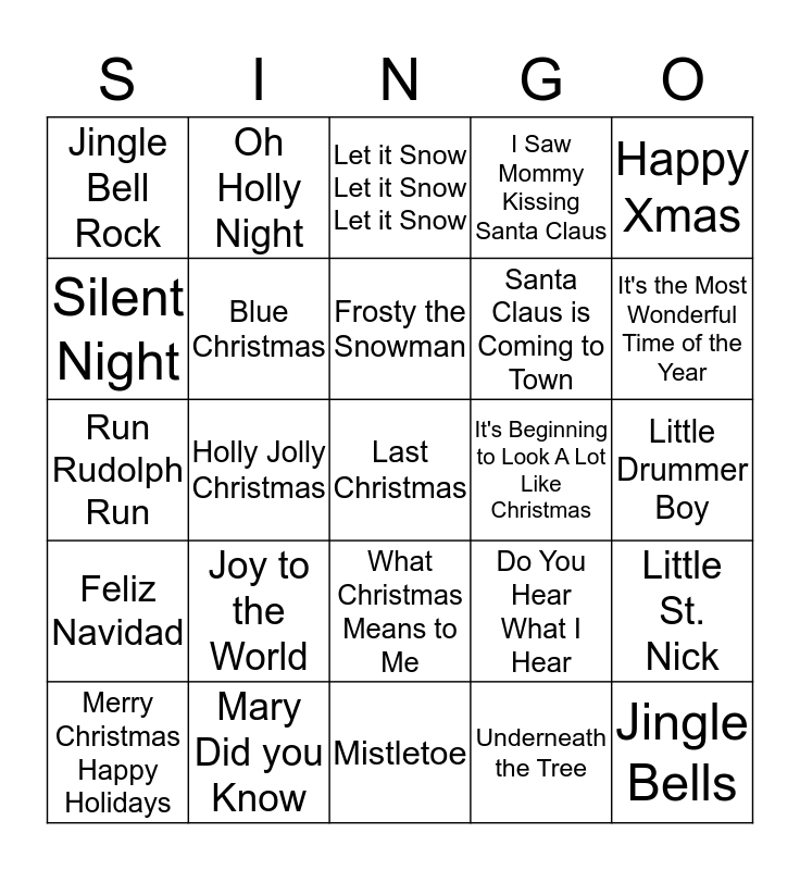 This bingo card has 2 images and 35 words: All I want for Christmas is you Blue Christmas Do You Hear What I Hear Feliz Navidad Frosty the Snowman Grown-Up Christmas List Happy Xmas Have yourself a Merry Little Christmas Holly Jolly Christmas I Saw Mommy Kissing Santa Claus I'll be Home, All I want for Christmas is you, Blue Christmas, Do You Hear What I Hear, Feliz Navidad, Frosty the Snowman, Grown-Up Christmas List, Happy Xmas, Have yourself a Merry Little Christmas, Holly Jolly Christmas, I Saw Mommy Kissing Santa Claus, I'll be Home For Christmas, It's Beginning to Look A Lot Like Christmas, It's the Most Wonderful Time of the Year, Jingle Bell Rock, Jingle Bells, Joy to the World, Last Christmas, Let it Snow Let it Snow Let it Snow, Little Drummer Boy, Little St. Nick, Mary Did you Know, Merry Christmas Happy Holidays, Mistletoe, Oh Holly Night, Run Rudolph Run, Santa Baby, Santa Claus is Coming to Town, Silent Night, Sleigh Ride, The Christmas Song, Underneath the Tree, What Christmas Means to Me, White Christmas and Wonderful Christmastime.