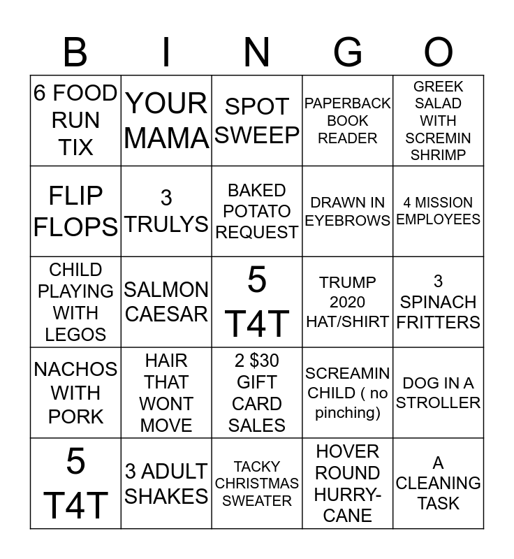 This bingo card has a free space and 29 words: 5 T4T, 3 ABC, SALMON CAESAR, 2 $50 GIFT CARD SALES, 6 FOOD RUN TIX, SPOT SWEEP, 3 TRULYS, HAIR THAT WONT MOVE, TRUMP 2020 HAT/SHIRT, 3 ADULT SHAKES, 3 SPINACH FRITTERS, A CLEANING TASK, TACKY CHRISTMAS SWEATER, HOVER ROUND HURRY-CANE, 4 MISSION EMPLOYEES, BILTMORE TOURISTS, 2 $30 GIFT CARD SALES, NACHOS WITH PORK, GREEK SALAD WITH SCREMIN SHRIMP, CHILD PLAYING WITH LEGOS, SCREAMIN CHILD ( no pinching), DARK BLUE SCRUNCii, DRAWN IN EYEBROWS, FLIP FLOPS, PAPERBACK BOOK READER, YOUR MAMA, DOG IN A STROLLER, BAKED POTATO REQUEST and SLIPKNOT T SHIRT.