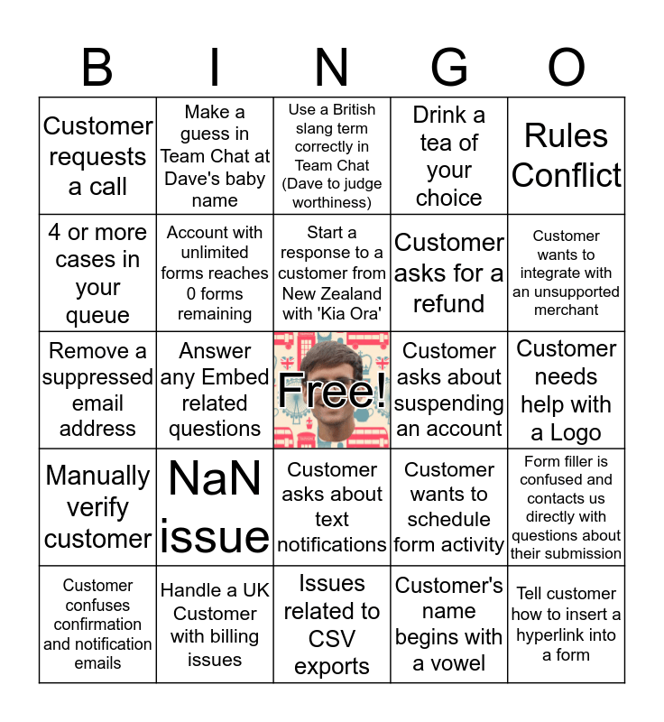 This bingo card has a free space and 24 words: NaN issue, Handle a UK Customer with billing issues, Start a response to a customer from New Zealand with 'Kia Ora', Customer confuses confirmation and notification emails, Rules Conflict, Customer requests a call, 4 or more cases in your queue, Make a guess in Team Chat at Dave's baby name, Customer asks about suspending an account, Customer asks about text notifications, Customer asks for a refund, Remove a suppressed email address, Customer wants to schedule form activity, Form filler is confused and contacts us directly with questions about their submission, Account with unlimited forms reaches 0 forms remaining, Customer's name begins with a vowel, Customer needs help with a Logo, Use a British slang term correctly in Team Chat (Dave to judge worthiness), Customer wants to integrate with an unsupported merchant, Answer any Embed related questions, Tell customer how to insert a hyperlink into a form, Manually verify customer, Drink a tea of your choice and Issues related to CSV exports.