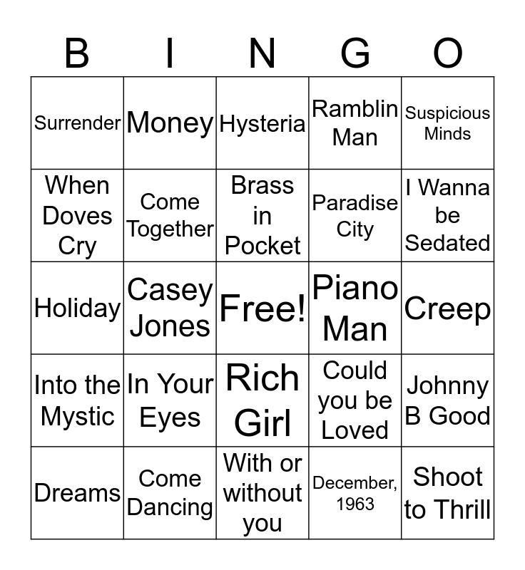 This bingo card has a free space and 34 words: Pretty Woman, December, 1963, Your Song, Me and Bobby McGee, Into the Mystic, Come Together, Suspicious Minds, Dreams, Money, Psycho Killer, Brass in Pocket, Hysteria, Respect, Paint it Black, Piano Man, I Wanna be Sedated, Come Dancing, Holiday, In Your Eyes, Could you be Loved, Rich Girl, Just what I needed, Surrender, Creep, With or without you, Shoot to Thrill, Ramblin Man, Runaway, Paradise City, When Doves Cry, Take it Easy, Casey Jones, Johnny B Good and Don't stop me now.