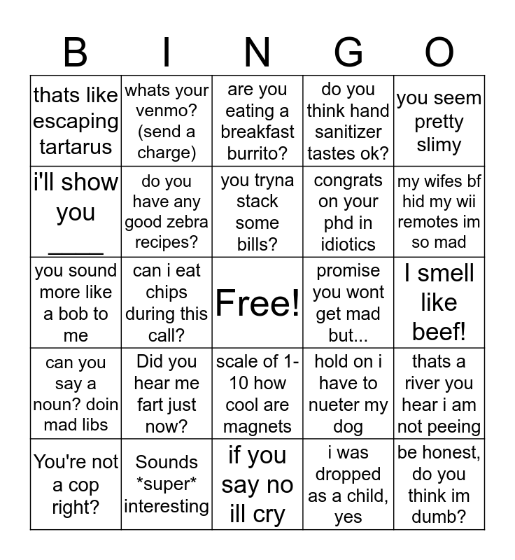 This bingo card has a free space and 24 words: Did you hear me fart just now?, Sounds *super* interesting, you tryna stack some bills?, You're not a cop right?, you seem pretty slimy, thats like escaping tartarus, i'll show you ____, whats your venmo? (send a charge), promise you wont get mad but..., scale of 1-10 how cool are magnets, congrats on your phd in idiotics, you sound more like a bob to me, hold on i have to nueter my dog, thats a river you hear i am not peeing, do you have any good zebra recipes?, i was dropped as a child, yes, I smell like beef!, are you eating a breakfast burrito?, my wifes bf hid my wii remotes im so mad, can i eat chips during this call?, be honest, do you think im dumb?, can you say a noun? doin mad libs, do you think hand sanitizer tastes ok? and if you say no ill cry.