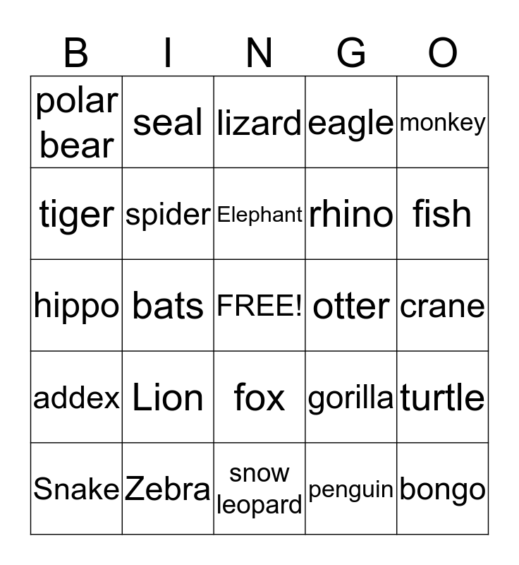 This bingo card has a free space and 24 words: Lion, Zebra, Elephant, Snake, monkey, polar bear, tiger, seal, otter, fox, rhino, hippo, gorilla, turtle, spider, penguin, crane, lizard, fish, bats, bongo, addex, eagle and snow leopard.