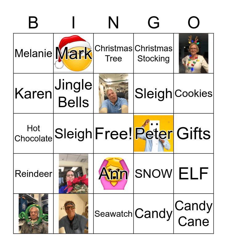 This bingo card has 8 images, a free space and 19 words: Melanie, Karen, Mark, Peter, Ann, Sleigh, Hot Chocolate, SNOW, ELF, Jingle Bells, Candy, Gifts, Christmas Tree, Cookies, Sleigh, Candy Cane, Reindeer, Christmas Stocking and Seawatch.