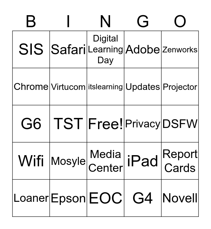 This bingo card has a free space and 34 words: Another County is Mentioned, G4, Bandwidth, Desktop, Wifi, Virtucom, Zenworks, Loaner, Safari, Server, itslearning, Digital Learning Day, Inventory, Google, Privacy, Projector, Epson, G6, Mosyle, iPad, Media Center, Power School, SIS, DSFW, EOC, Novell, Adobe, WIDA, Updates, Chrome, PO, TST, Report Cards and T&L.