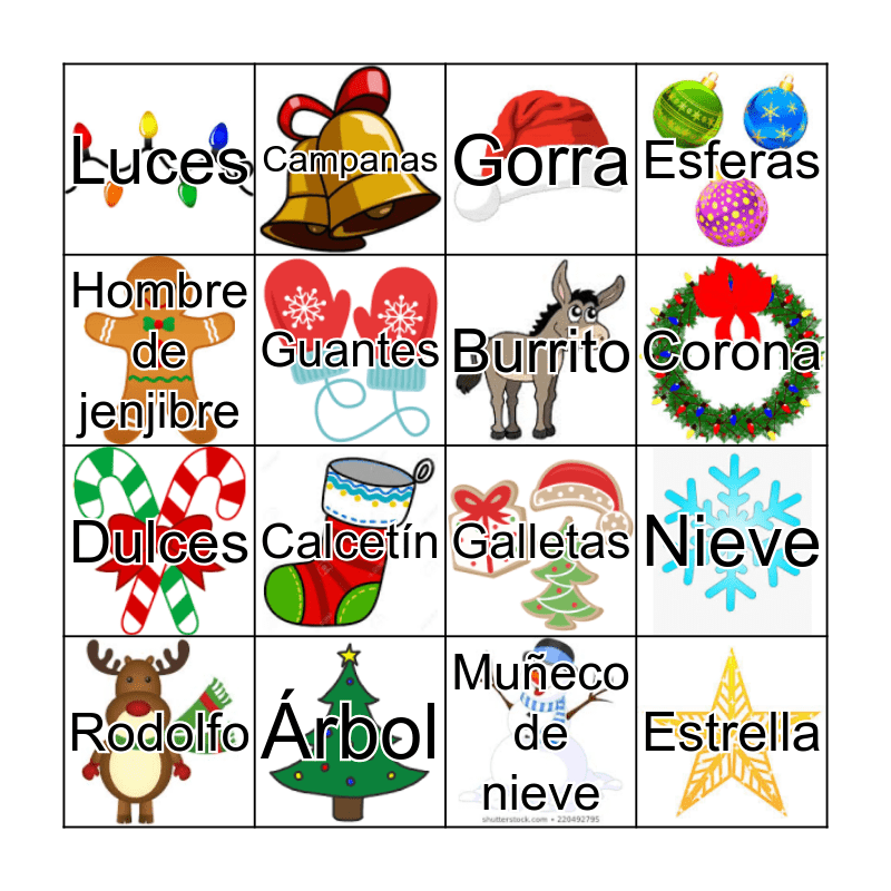 This bingo card has 20 images and 20 words: Nieve, Reyes Magos, Gorra, Pingüino, Rodolfo, Hombre de jenjibre, Árbol, Luces, Dulces, Campanas, Calcetín, Galletas, Guantes, Estrella, Burrito, Duende, Corona, Esferas, Muñeco de nieve and Villancicos.