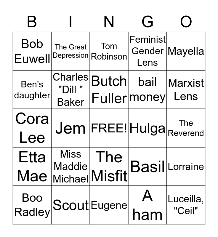 This bingo card has a free space and 24 words: Miss Maddie Michael, Scout, Butch Fuller, Boo Radley, Mayella, Bob Euwell, Ben's daughter, The Great Depression, Hulga, The Misfit, bail money, Cora Lee, Basil, Lorraine, Charles "Dill " Baker, A ham, The Reverend, Tom Robinson, Marxist Lens, Jem, Luceilla, "Ceil", Etta Mae, Feminist Gender Lens and Eugene.