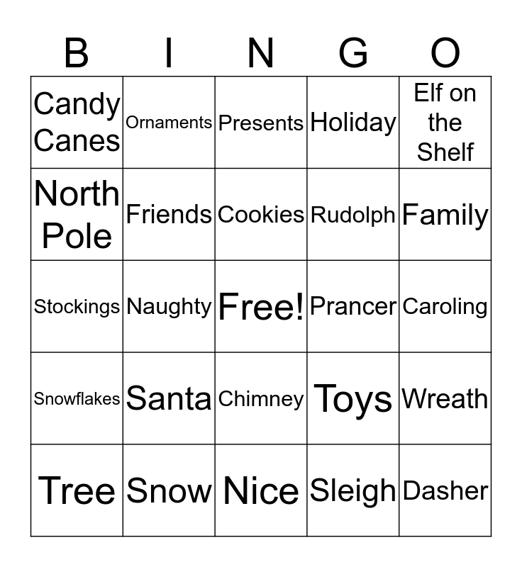 This bingo card has a free space and 24 words: Santa, Snow, Cookies, Tree, Elf on the Shelf, Candy Canes, North Pole, Ornaments, Prancer, Chimney, Rudolph, Stockings, Toys, Wreath, Friends, Sleigh, Caroling, Presents, Family, Naughty, Dasher, Snowflakes, Holiday and Nice.