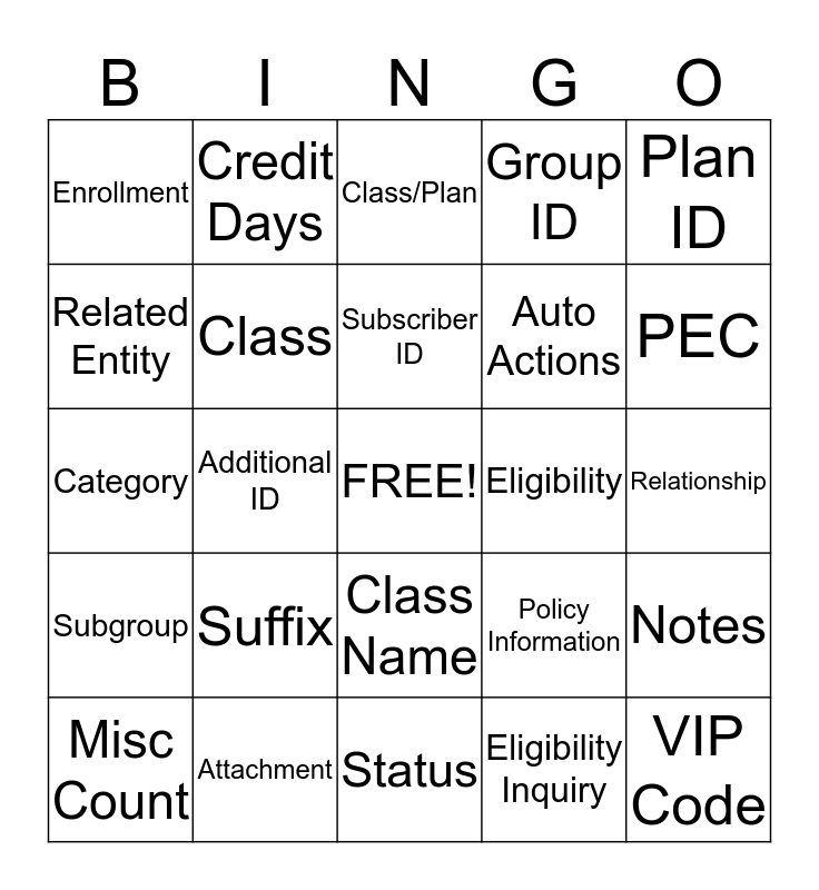 This bingo card has a free space and 35 words: 31 MD Baby, Subscriber, Subscriber/Family, Class, Class Name, Group ID, Related Entity, Address, Subscriber ID, Product ID, Category, Plan ID, Indicative, COB, Enrollment, Eligibility, Eligibility Inquiry, Additional ID, Subgroup, VIP Code, Policy Information, Misc Count, Notes, Attachment, Class/Plan, PEC, Conversion Date, Received Date, Auto Actions, Relationship, HIPAA, Status, Suffix, Credit Days and Event.