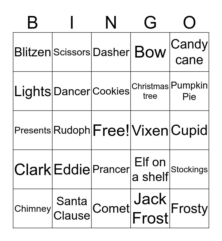 This bingo card has a free space and 30 words: Santa Clause, Miss Clause, Rudoph, Donner, Blitzen, Dasher, Dancer, Prancer, Vixen, Comet, Cupid, Frosty, Jack Frost, Chest nuts, Pumpkin Pie, Turkey, Elf on a shelf, Clark, Eddie, Candy cane, Presents, Tape, Scissors, Christmas tree, Lights, Bow, Stockings, Chimney, Cookies and Milk.