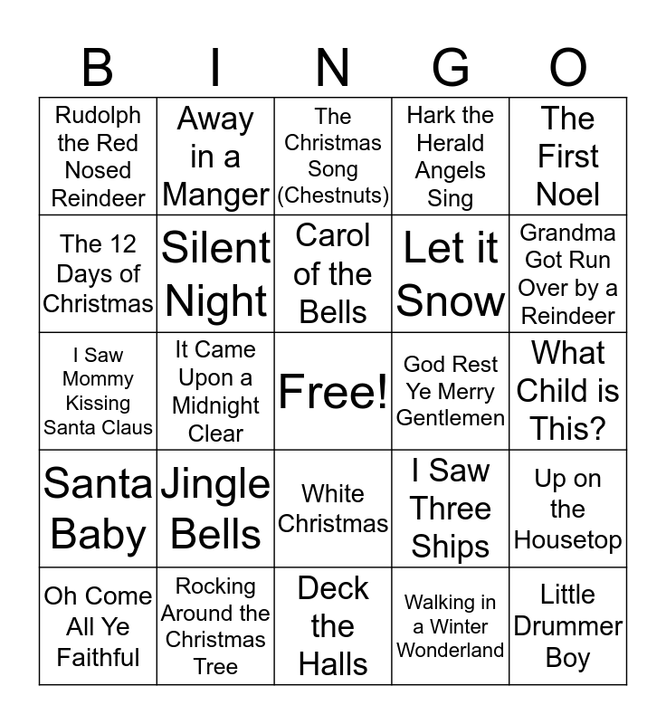 This bingo card has a free space and 49 words: Oh Holy Night, Little Drummer Boy, We Wish You a Merry Christmas, Deck the Halls, Jingle Bells, Oh Little Town of Bethlehem, Away in a Manger, We Three Kings, The 12 Days of Christmas, Go Tell it on the Mountain, Silent Night, Hark the Herald Angels Sing, Up on the Housetop, I Saw Three Ships, Joy to the World, Do You Hear What I Hear?, Carol of the Bells, God Rest Ye Merry Gentlemen, Nutcracker Suite, The First Noel, It Came Upon a Midnight Clear, Walking in a Winter Wonderland, Rudolph the Red Nosed Reindeer, Let it Snow, Jingle Bell Rock, Grandma Got Run Over by a Reindeer, Oh Come All Ye Faithful, Frosty the Snowman, White Christmas, Santa Baby, It's Beginning to Look a Lot Like Christmas, Blue Christmas, Santa Claus is Coming to Town, Sleigh Ride, Rocking Around the Christmas Tree, Here Comes Santa Claus, Silver Bells, I'll Be Home for Christmas, What Child is This?, Mary Did You Know?, The Grinch, All I Want for Christmas is You, Angels We Have Heard on High, All I Want for Christmas is My Two Front Teeth, I Saw Mommy Kissing Santa Claus, The Christmas Song (Chestnuts), This Christmas, Holly Jolly Christmas and Feliz Navidad.