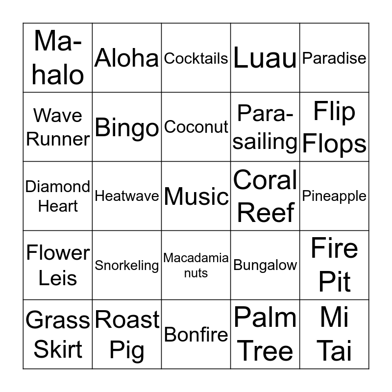 This bingo card has 25 words: Snorkeling, Bonfire, Coconut, Grass Skirt, Paradise, Ma-halo, Wave Runner, Aloha, Coral Reef, Macadamia nuts, Para-sailing, Diamond Heart, Bungalow, Fire Pit, Bingo, Mi Tai, Pineapple, Cocktails, Flip Flops, Heatwave, Music, Roast Pig, Flower Leis, Luau and Palm Tree.