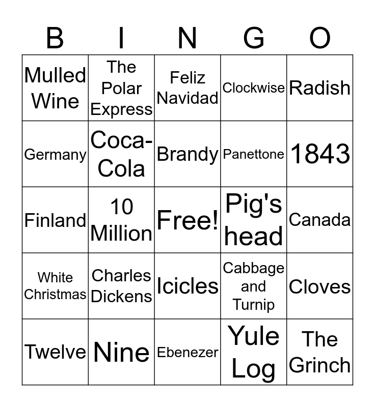 This bingo card has a free space and 50 words: Arnold Schwarzenegger, The Grinch, Bing Crosby, Ebenezer, Charles Dickens, Four, The Polar Express, Eggnog, Germany, Pigs in a blanket, Coca-Cola, Clockwise, Cloves, Cabbage and Turnip, A Hen, Wattle, Brandy, Pig's head, Sugar Plums, Radish, 10 Million, Yule Log, Mulled Wine, Panettone, Mince Pies, Pear, 1843, Boxing Day, Feliz Navidad, Icicles, Saint Nick, Kris Kringle, The Netherlands, Robert L. May, Nine, Germany, Thomas Edison, Saint Nicholas, Oklahoma, Canada, 1870, Italy, Père Noël, Theodore Roosevelt, Twelve, Finland, Bethlehem, Silver, White Christmas and Grapes.