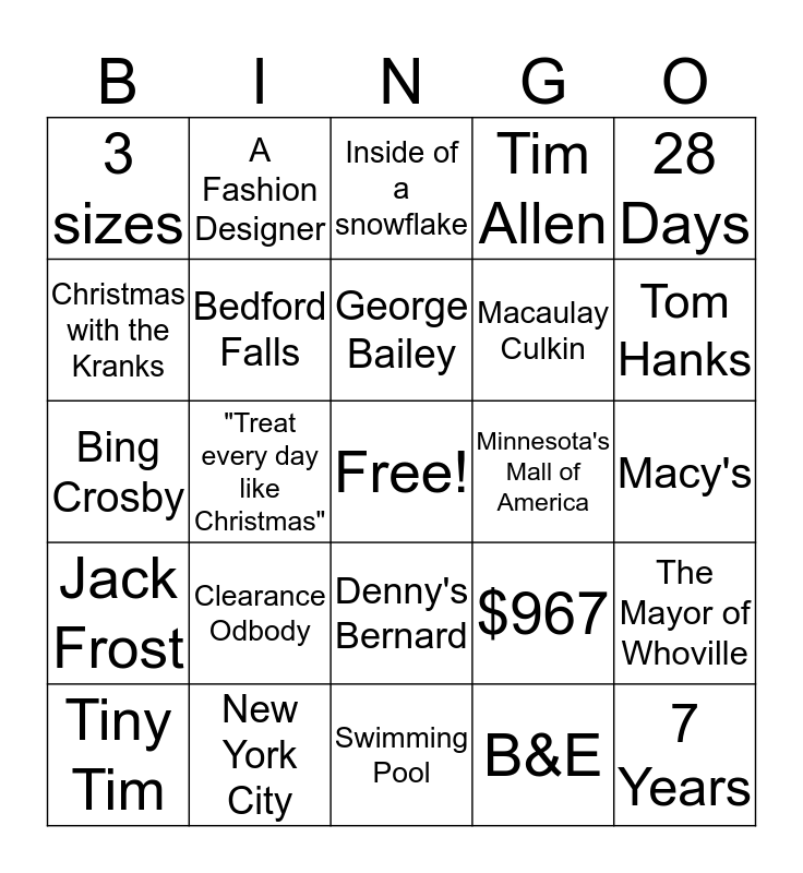 This bingo card has a free space and 29 words: Tiny Tim, Jamie Lee Curtis and Tim Allen, "Treat every day like Christmas", Brad and Kate, 3 sizes, Inside of a snowflake, Bedford Falls, Clearance Odbody, Minnesota's Mall of America, New York City, Macy's, 7 Years, Swimming Pool, B&E, Tom Hanks, A hole in his pocket, Denny's Bernard, Jack Frost, 28 Days, Bing Crosby, $967, Singing loud for all to hear, Macaulay Culkin, Christmas with the Kranks, Tim Allen, A Fashion Designer, The Mayor of Whoville, George Bailey and Jack in the Box.