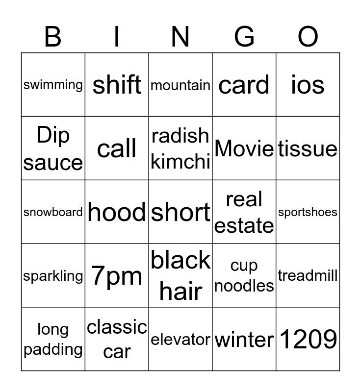 This bingo card has 25 words: 7pm, elevator, radish kimchi, long padding, ios, swimming, Dip sauce, shift, real estate, black hair, Movie, snowboard, cup noodles, treadmill, call, 1209, sportshoes, mountain, tissue, hood, short, classic car, sparkling, card and winter.