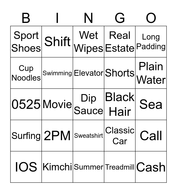 This bingo card has a free space and 24 words: 2PM, Kimchi, Elevator, IOS, Long Padding, Sport Shoes, Cup Noodles, Shift, Black Hair, Sweatshirt, Shorts, 0525, Classic Car, Call, Swimming, Treadmill, Sea, Wet Wipes, Plain Water, Movie, Cash, Surfing, Real Estate and Summer.