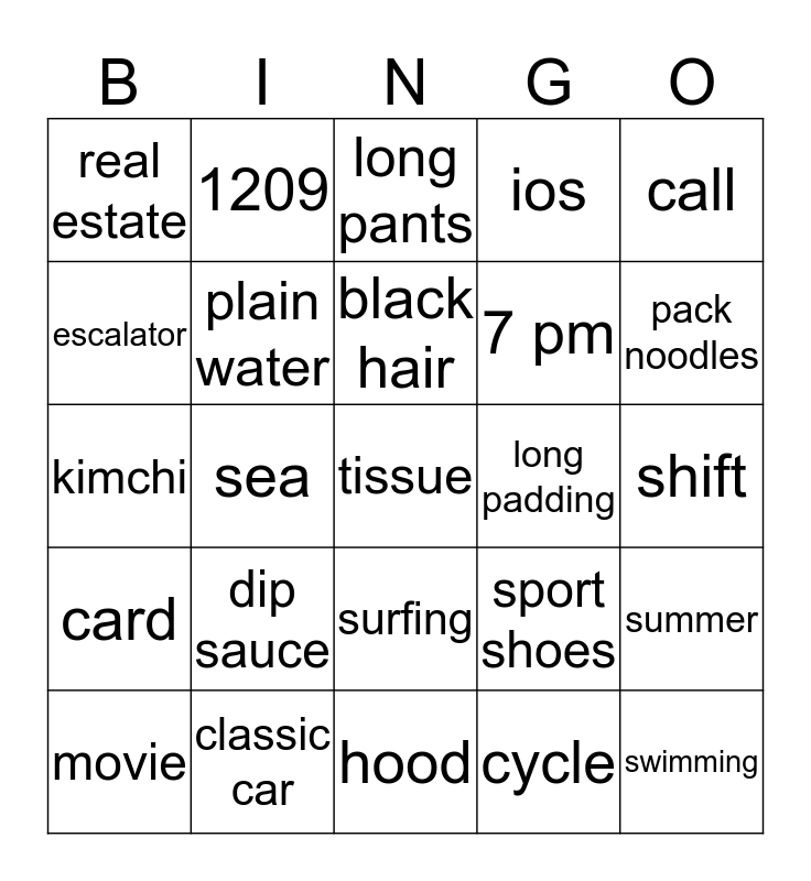 This bingo card has 25 words: dip sauce, hood, black hair, movie, call, real estate, escalator, 1209, long padding, surfing, 7 pm, kimchi, sport shoes, summer, plain water, swimming, shift, long pants, pack noodles, sea, tissue, classic car, card, ios and cycle.