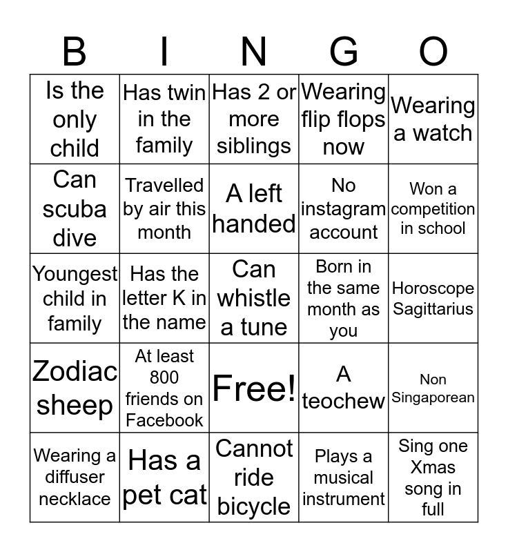 This bingo card has 26 words: Free!, Plays a musical instrument, A left handed, Has a pet cat, Wearing a watch, Is the only child, Can scuba dive, Has twin in the family, Horoscope Sagittarius, A teochew, No instagram account, Youngest child in family, Non Singaporean, Wearing a diffuser necklace, Has the letter K in the name, Completed a full marathon, Wearing flip flops now, Zodiac sheep, Has 2 or more siblings, Can whistle a tune, Won a competition in school, Cannot ride bicycle, Born in the same month as you, At least 800 friends on Facebook, Travelled by air this month and Sing one Xmas song in full.