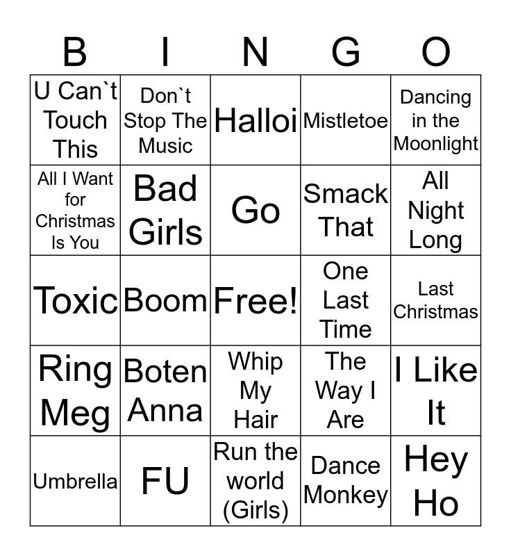 This bingo card has a free space and 31 words: Run the world (Girls), All I Do Is Win, Boom, Gimme More, U Can`t Touch This, Halloi, Bad Girls, The Way I Are, One Last Time, Dance Monkey, Last Christmas, Hey Ho, Hvem er hun?, Feliz Navidad, All Night Long, Don`t Mess With My Man, I Like It, Boten Anna, Ring Meg, Whip My Hair, Dancing in the Moonlight, Crazy in Love, Umbrella, Don`t Stop The Music, Smack That, All I Want for Christmas Is You, Mistletoe, Toxic, FU, Go and Mama Said.