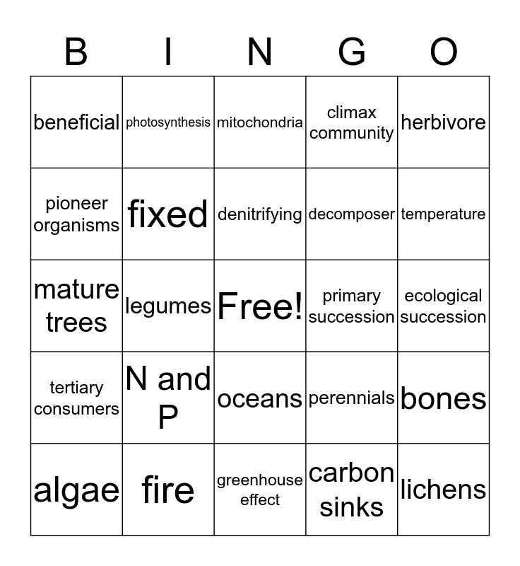 This bingo card has a free space and 24 words: N and P, fire, denitrifying, algae, herbivore, beneficial, pioneer organisms, photosynthesis, primary succession, oceans, decomposer, mature trees, perennials, bones, fixed, carbon sinks, ecological succession, mitochondria, temperature, legumes, lichens, tertiary consumers, climax community and greenhouse effect.
