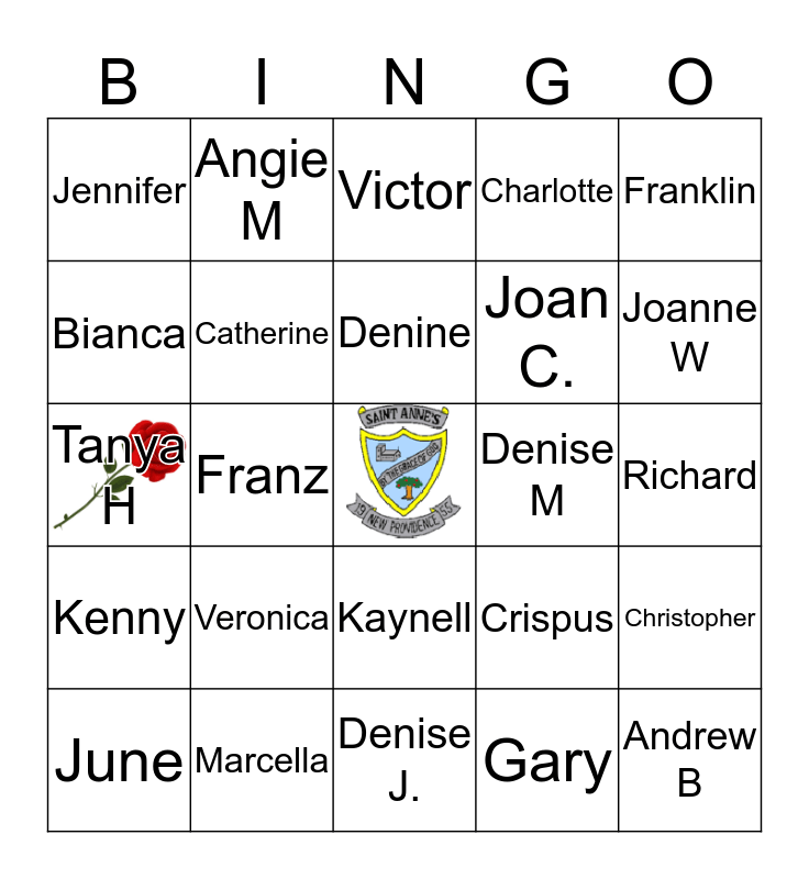 This bingo card has 1 images, a free space and 49 words: Adrian, Andrew B, Cecile, Denise J., Veronica, Pamela, Angie M, B. Joann, Bianca, Carol, Catherine, Charlotte, Christopher, Crispus, Cynthia, Dale, Denine, Denise M, Dionne, Franklin, Franz, Gary, Jennifer, Joan C., Joanne K, Joanne W, June, Keva, Kaynell, Kenny, Kevin, Kim, Larry, Makarios, Marcella, Marcia, Nigel, Patrick, Richard, Rochelle, Rudolph, Ruthann, Shelly, Tanya C, Tanya H, Victor, Wayne, Yvette and Nicolette.