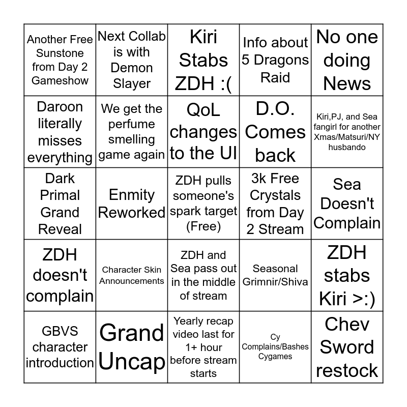 This bingo card has a free space and 24 words: Character Skin Announcements, Grand Uncap, QoL changes to the UI, GBVS character introduction, No one doing News, Another Free Sunstone from Day 2 Gameshow, Daroon literally misses everything, Next Collab is with Demon Slayer, 3k Free Crystals from Day 2 Stream, ZDH and Sea pass out in the middle of stream, D.O. Comes back, Dark Primal Grand Reveal, Seasonal Grimnir/Shiva, ZDH stabs Kiri >:), We get the perfume smelling game again, Cy Complains/Bashes Cygames, Sea Doesn't Complain, Kiri Stabs ZDH :(, Kiri,PJ, and Sea fangirl for another Xmas/Matsuri/NY husbando, Enmity Reworked, Chev Sword restock, ZDH doesn't complain, Info about 5 Dragons Raid and Yearly recap video last for 1+ hour before stream starts.
