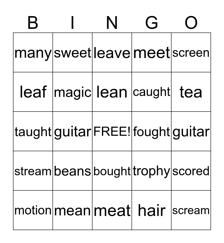This bingo card has a free space and 24 words: beans, mean, lean, motion, screen, many, leaf, sweet, fought, bought, caught, taught, trophy, scored, magic, hair, guitar, leave, tea, guitar, scream, stream, meet and meat.
