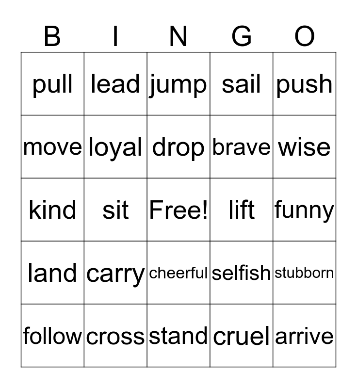 This bingo card has a free space and 24 words: carry, cross, drop, follow, push, pull, move, lead, lift, cheerful, brave, kind, selfish, stubborn, loyal, cruel, funny, jump, wise, sit, arrive, land, sail and stand.