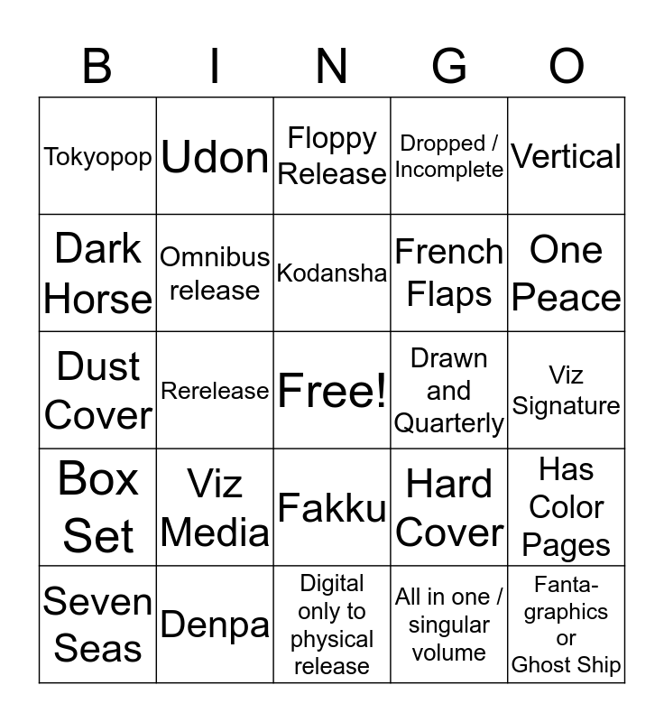 This bingo card has a free space and 24 words: Viz Media, Denpa, Kodansha, Seven Seas, Vertical, Tokyopop, Dark Horse, Udon, Drawn and Quarterly, Fakku, French Flaps, Dust Cover, Hard Cover, Has Color Pages, Omnibus release, All in one / singular volume, Viz Signature, Floppy Release, One Peace, Rerelease, Fanta-graphics or Ghost Ship, Box Set, Dropped / Incomplete and Digital only to physical release.
