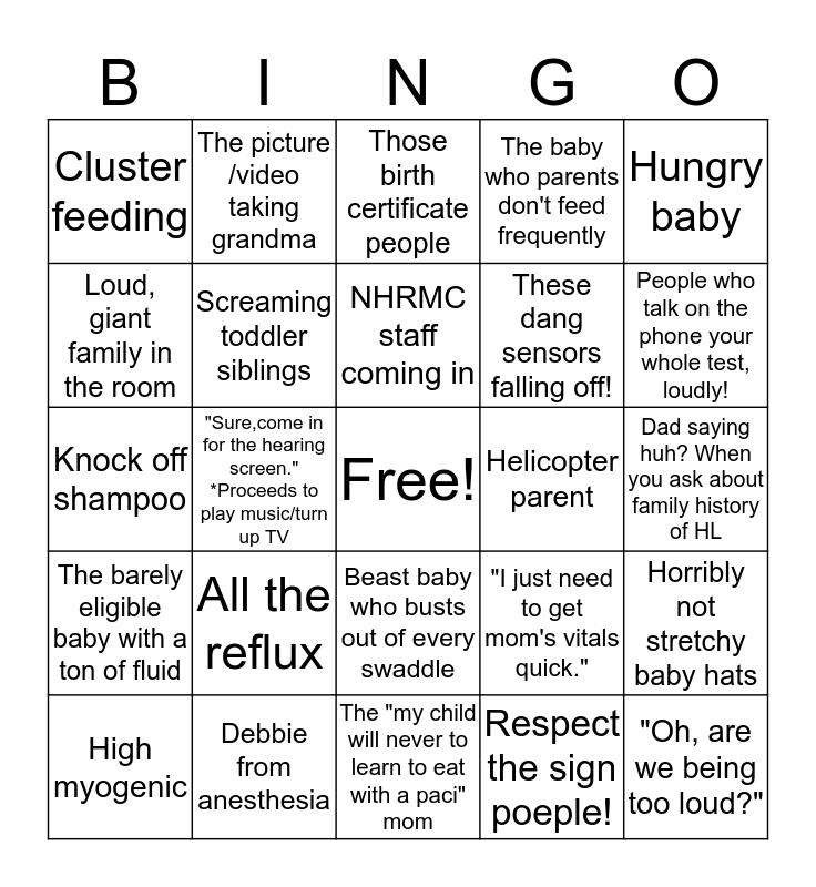 This bingo card has a free space and 24 words: All the reflux, Debbie from anesthesia, NHRMC staff coming in, High myogenic, Hungry baby, Cluster feeding, Loud, giant family in the room, The picture /video taking grandma, Helicopter parent, Beast baby who busts out of every swaddle, These dang sensors falling off!, Knock off shampoo, "I just need to get mom's vitals quick.", Horribly not stretchy baby hats, Screaming toddler siblings, Respect the sign poeple!, Dad saying huh? When you ask about family history of HL, Those birth certificate people, People who talk on the phone your whole test, loudly!, "Sure,come in for the hearing screen." *Proceeds to play music/turn up TV, "Oh, are we being too loud?", The barely eligible baby with a ton of fluid, The baby who parents don't feed frequently and The "my child will never to learn to eat with a paci" mom.