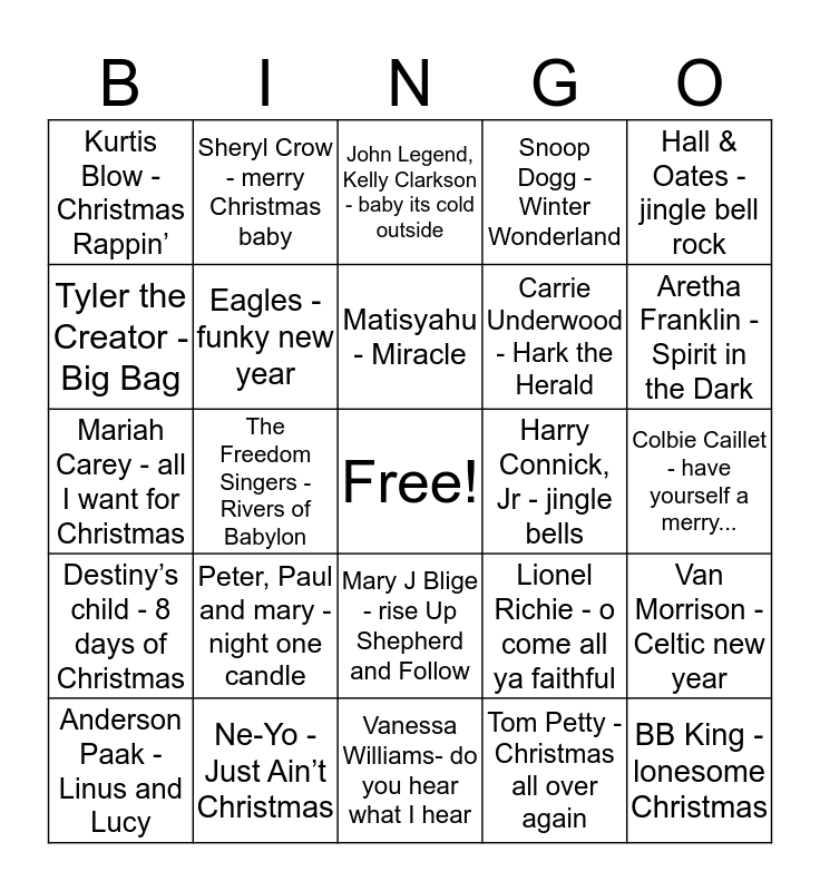 This bingo card has a free space and 54 words: Busta Rhymes - Grinch 2000, Destiny’s child - 8 days of Christmas, TLC - Sleigh Ride, Tuf MCs - Jingle beat, Mary J Blige - rise Up Shepherd and Follow, Usher - This Christmas, Snoop Dogg - Winter Wonderland, Run DMC - Christmas in Hollis, Tyler the Creator - Big Bag, Kanye West - Christmas in Harlem, Kurtis Blow - Christmas Rappin’, Macklemore - it’s Christmas Time, Ne-Yo - Just Ain’t Christmas, Anderson Paak - Linus and Lucy, Jessie J, Boyz II Men - winter wonderland, Vanessa Williams- do you hear what I hear, BB King - lonesome Christmas, Carrie Underwood - Hark the Herald, Elton John - step into Christmas, Colbie Caillet - have yourself a merry..., Lionel Richie - o come all ya faithful, Fiona Apple - frosty the snowman, Harry Connick, Jr - jingle bells, Hall & Oates - jingle bell rock, Celine Dion - the prayer, Sheryl Crow - merry Christmas baby, Bob Dylan - the Christmas blues, Coldplay - Christmas lights, Whitney Houston - joy to the world, Tom Petty - Christmas all over again, Josh Groban - little drummer boy, Tracy Chapman - o holy night, Sting- I saw 3 ships, Norah jones - peace, John Legend, Kelly Clarkson - baby its cold outside, Bruce Springsteen - Santa Claus is coming to town, Mariah Carey - all I want for Christmas, Van Morrison - Celtic new year, Stevie Wonder - what Christmas means to me, Eagles - funky new year, Maroon 5 - happy Christmas, Gwen Stefani - secret Santa, Regina Spektor - my dear acquaintance, Candice Boyd - Carol of the Bells, Peter, Paul and mary - night one candle, Sharon jones and the Dap Kings - 8 days of Hanukkah, Adam Sandler- the Chanukah Song, Too $hort - Hanukkah Song, Matisyahu - Miracle, The Freedom Singers - Rivers of Babylon, Aretha Franklin - Spirit in the Dark, James brown - Get on the good foot, Baha Men - Back to the Island and Bebe Winans - Lift Every Voice and Sing.