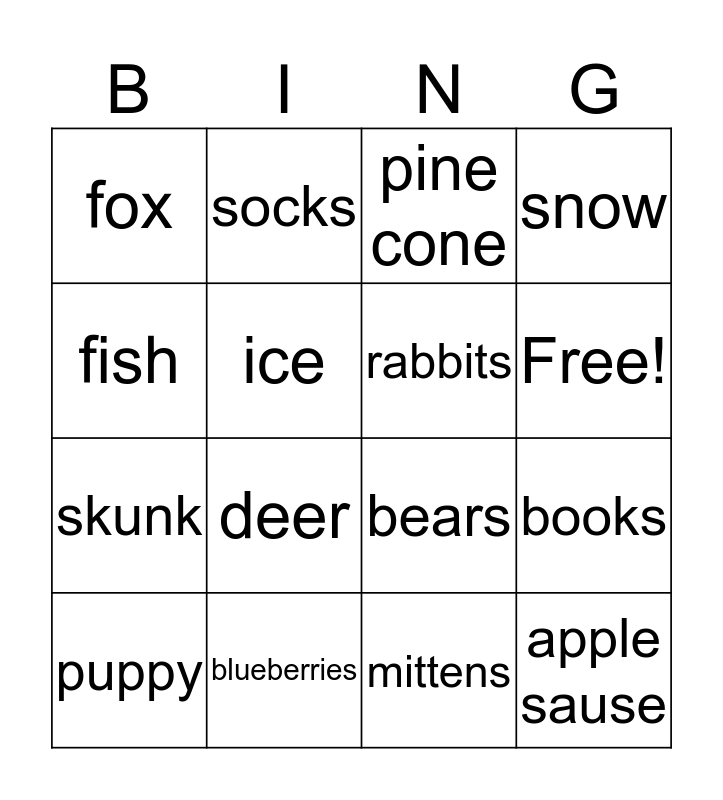 This bingo card has 17 words: mittens, puppy, pine cone, fox, deer, snow, books, rabbits, Free!, ice, blueberries, bears, fish, socks, skunk, bread and apple sause.