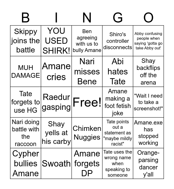 This bingo card has a free space and 24 words: Cypher bullies Amane, Shay yells at his carby, Nari misses Bene, Tate uses the wrong name when speaking to someone, Abby confusing people when saying 'gotta go take Abby out', Skippy joins the battle, YOU USED SHIRK!, Ben agreeing with us to bully Amane, Amane making a foot fetish joke, "Wait I need to take a screenshot!", Tate forgets to use HG, Amane cries, Tate points out a statement as "maybe mildly racist", Amane.exe has stopped working, MUH DAMAGE, Swoath, Amane forgets DP, Shiro's controller disconnects, Shay backflips off the arena, Nari doing battle with the raccoon, Raedur gasping, Chimken Nuggies, Abi hates Tate and Orange-parsing dancer y'all.