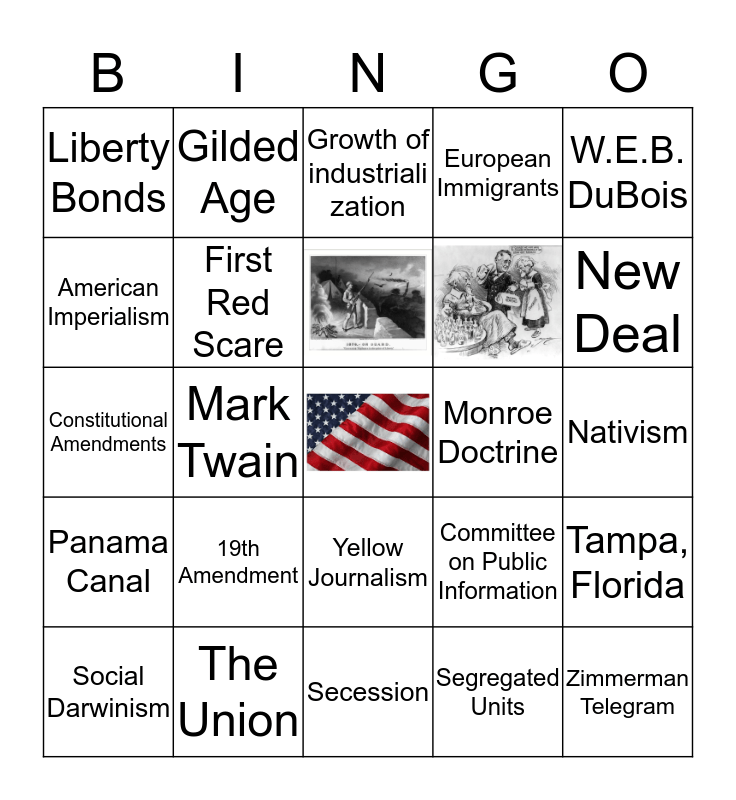 This bingo card has 2 images, a free space and 22 words: 19th Amendment, The Union, Social Darwinism, W.E.B. DuBois, Liberty Bonds, American Imperialism, Gilded Age, Monroe Doctrine, Yellow Journalism, Constitutional Amendments, Committee on Public Information, Tampa, Florida, First Red Scare, Segregated Units, Nativism, Growth of industriali zation, New Deal, Mark Twain, Zimmerman Telegram, Panama Canal, European Immigrants and Secession.