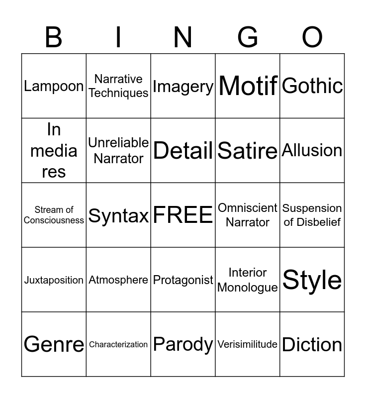 This bingo card has a free space and 24 words: Atmosphere, Characterization, Detail, Genre, Gothic, Lampoon, In media res, Narrative Techniques, Omniscient Narrator, Protagonist, Satire, Stream of Consciousness, Interior Monologue, Style, Unreliable Narrator, Verisimilitude, Suspension of Disbelief, Imagery, Allusion, Syntax, Diction, Juxtaposition, Motif and Parody.