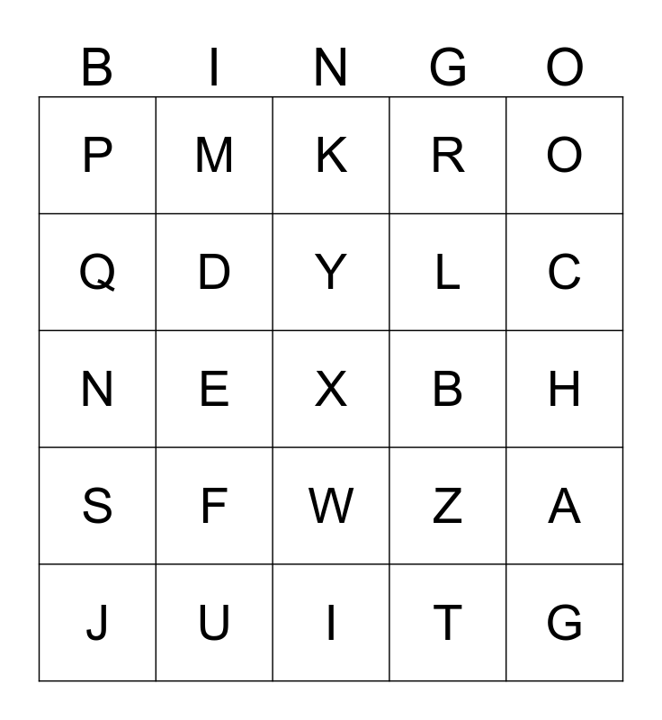 This bingo card has 25 words: F, I, Y, J, O, P, Q, M, B, W, L, N, Z, A, D, G, H, K, C, E, X, U, S, R and T.