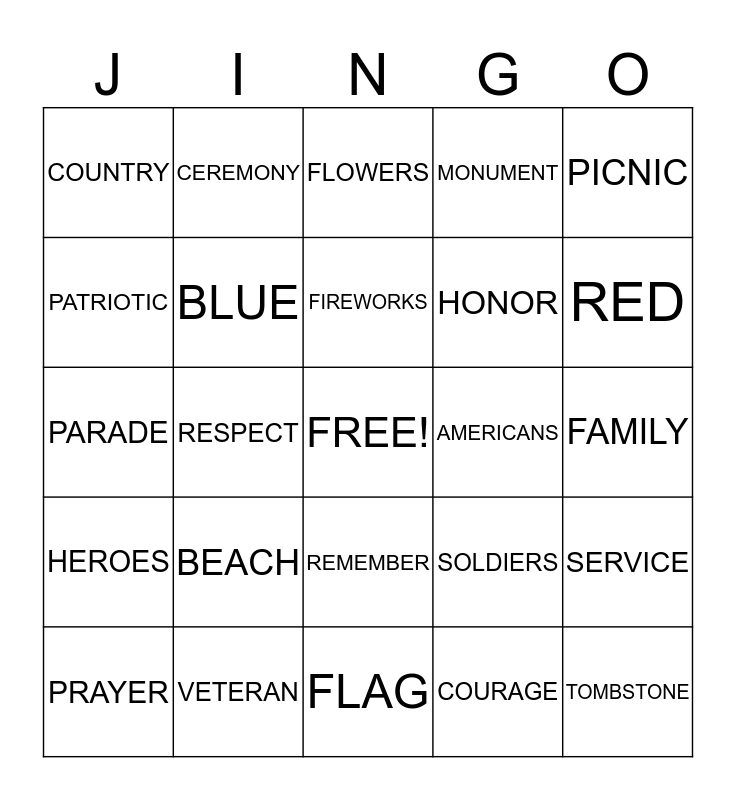 This bingo card has a free space and 27 words: SOLDIERS, MAY, HONOR, FLAG, PATRIOTIC, FLOWERS, CEREMONY, HEROES, AMERICANS, SERVICE, PARADE, MONUMENT, PRAYER, VETERAN, RED, WHITE, BLUE, FIREWORKS, BEACH, COUNTRY, FAMILY, COURAGE, RESPECT, TOMBSTONE, REMEMBER, PICNIC and DEFEND.