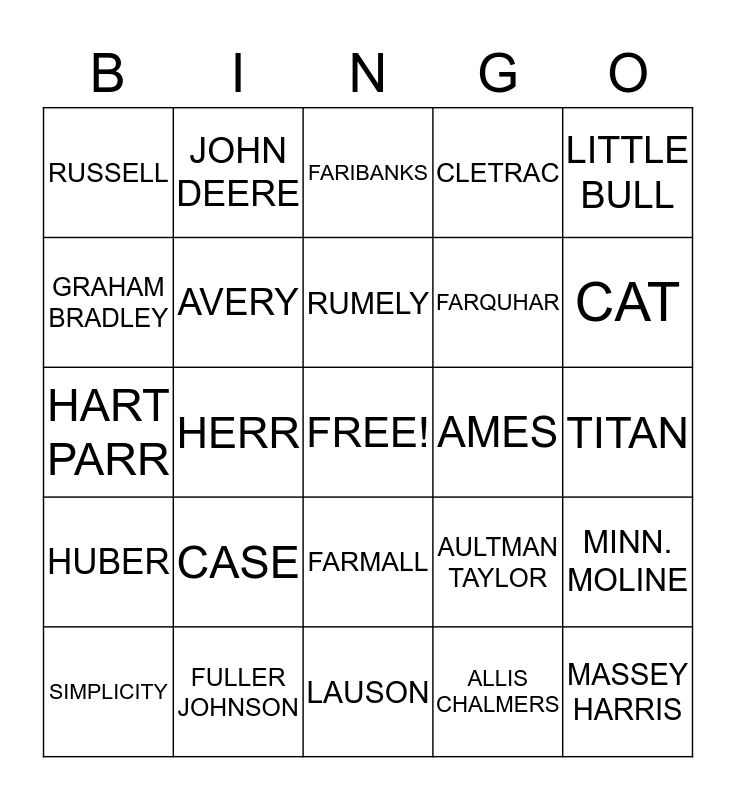 This bingo card has a free space and 24 words: CASE, FULLER JOHNSON, RUMELY, SIMPLICITY, LITTLE BULL, RUSSELL, GRAHAM BRADLEY, JOHN DEERE, AMES, FARMALL, FARQUHAR, HART PARR, AULTMAN TAYLOR, MINN. MOLINE, AVERY, ALLIS CHALMERS, TITAN, FARIBANKS, CAT, HERR, MASSEY HARRIS, HUBER, CLETRAC and LAUSON.