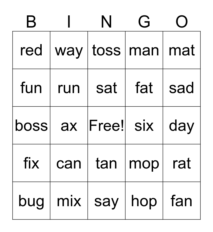 This bingo card has a free space and 24 words: can, mix, sat, bug, mat, red, fun, way, six, tan, fat, boss, mop, rat, run, hop, day, toss, sad, ax, fan, fix, man and say.
