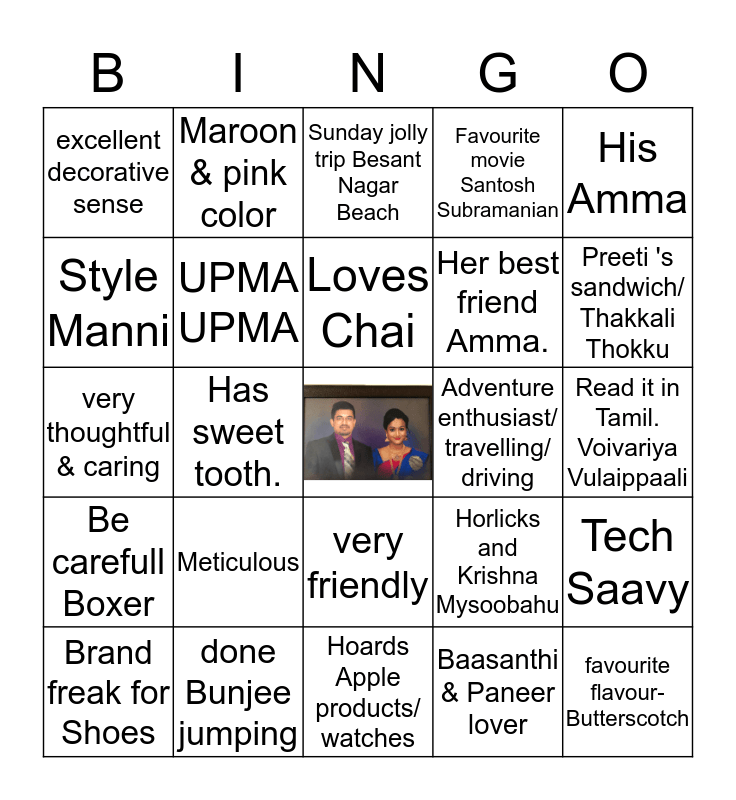 This bingo card has a free space and 34 words: Watches football all night, Baasanthi & Paneer lover, Saravana bhavan Parota $ kuruma, very wise, Be carefull Boxer, UPMA UPMA, His Amma, Brand freak for Shoes, Maroon & pink color, Her name is from Thatha's, Loves Chai, Sunday jolly trip Besant Nagar Beach, Creative Gift Giver, Loves to surprise close ones, Adventure enthusiast/ travelling/ driving, Preeti 's sandwich/ Thakkali Thokku, done Bunjee jumping, very thoughtful & caring, Meticulous, Horlicks and Krishna Mysoobahu, very friendly, Loves shopping, excellent decorative sense, Read it in Tamil. Voivariya Vulaippaali, Hoards Apple products/ watches, favourite flavour-Butterscotch, Favourite movie Santosh Subramanian, Game freak, Her best friend Amma., Style Manni, loves playing video games, Has sweet tooth., Tech Saavy and beach person.