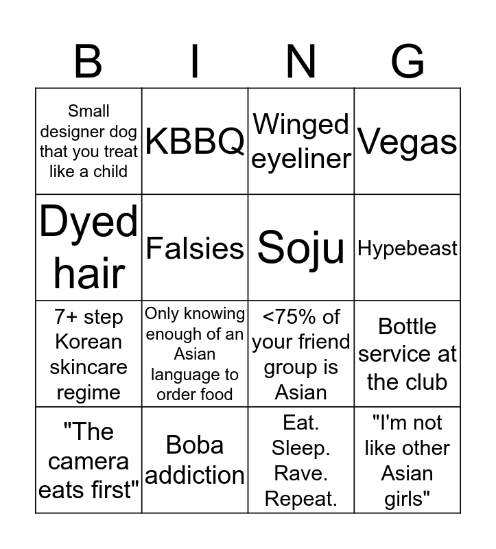 This bingo card has 16 words: Boba addiction, Bottle service at the club, Winged eyeliner, Small designer dog that you treat like a child, 7+ step Korean skincare regime, KBBQ, <75% of your friend group is Asian, Eat. Sleep. Rave. Repeat., Dyed hair, Falsies, "The camera eats first", Vegas, Only knowing enough of an Asian language to order food, Hypebeast, Soju and "I'm not like other Asian girls".