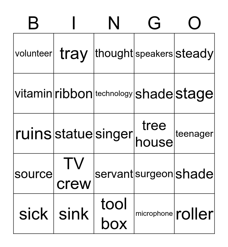 This bingo card has 25 words: TV crew, tool box, technology, sick, steady, volunteer, vitamin, tray, tree house, servant, shade, ruins, surgeon, shade, ribbon, roller, teenager, thought, stage, statue, singer, sink, source, speakers and microphone.