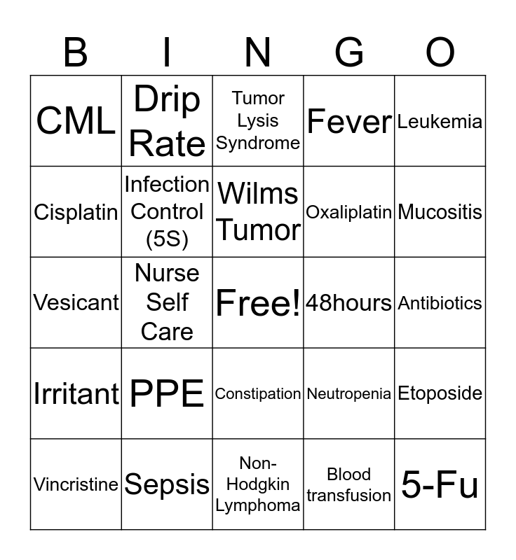 This bingo card has a free space and 29 words: Vincristine, Hodgkin Lymphoma, Nurse Self Care, Doxo, CML, Tumor Lysis Syndrome, Infection Control (5S), PPE, 48hours, Sepsis, Antibiotics, 5-Fu, Non-Hodgkin Lymphoma, Blood transfusion, Mucositis, Morphine, Constipation, Irritant, Leukemia, Vesicant, Neutropenia, Palliative care, Oxaliplatin, Cisplatin, Fever, Drip Rate, Etoposide, Wilms Tumor and Chemotherapy.