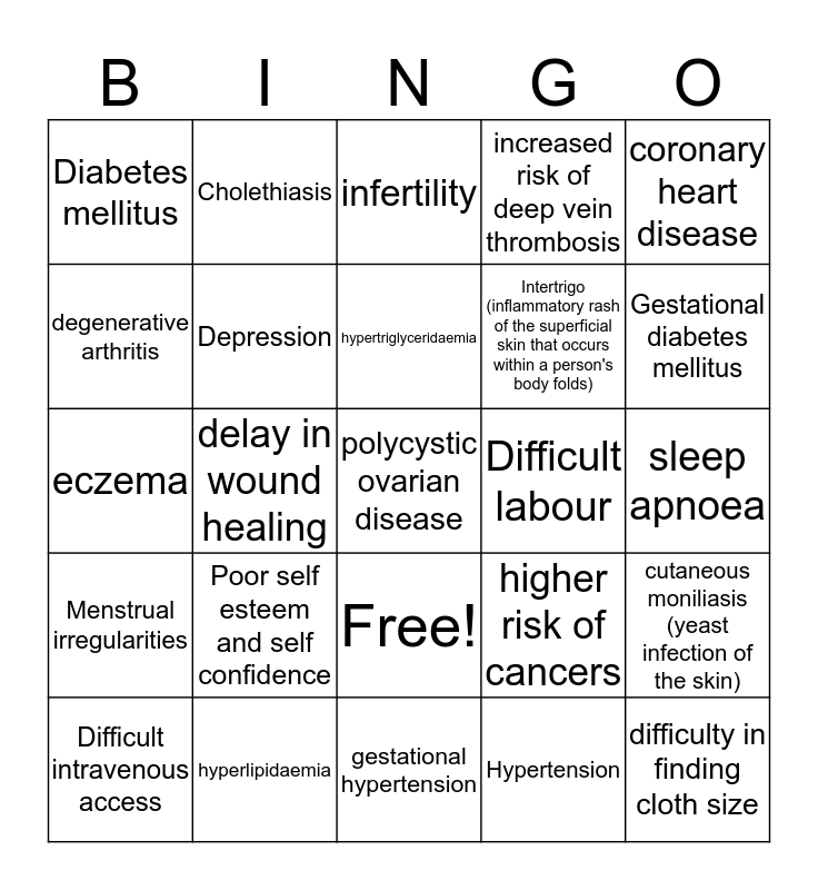 This bingo card has 26 words: Free!, Hypertension, hypertriglyceridaemia, hyperlipidaemia, coronary heart disease, Diabetes mellitus, degenerative arthritis, Cholethiasis, sleep apnoea, higher risk of cancers, Intertrigo (inflammatory rash of the superficial skin that occurs within a person's body folds), eczema, cutaneous moniliasis (yeast infection of the skin), Difficult intravenous access, delay in wound healing, increased risk of wound infection and reopening, increased risk of deep vein thrombosis, Menstrual irregularities, infertility, polycystic ovarian disease, Gestational diabetes mellitus, gestational hypertension, Difficult labour, Poor self esteem and self confidence, Depression and difficulty in finding cloth size.