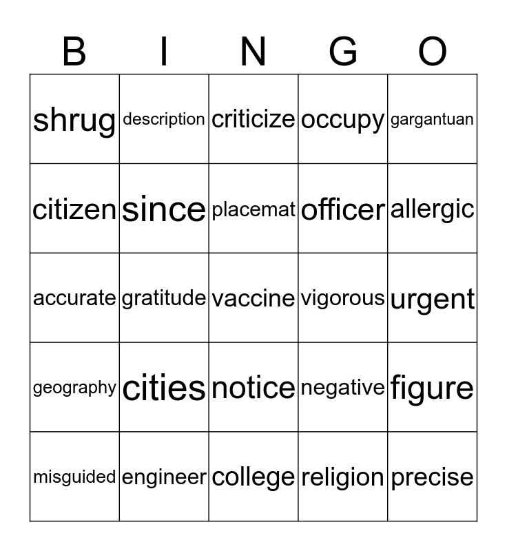 This bingo card has 25 words: cities, college, placemat, misguided, gargantuan, shrug, citizen, description, vigorous, notice, officer, accurate, negative, figure, since, precise, urgent, criticize, allergic, gratitude, vaccine, engineer, geography, occupy and religion.