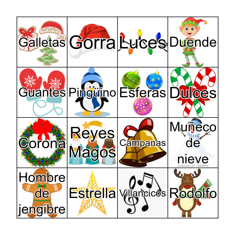 This bingo card has 20 images and 20 words: Muñeco de nieve, Árbol, Luces, Calcetín, Hombre de jengibre, Guantes, Estrella, Galletas, Corona, Gorra, Reyes Magos, Campanas, Pingüino, Rodolfo, Esferas, Nieve, Dulces, Duende, Villancicos and Burrito.