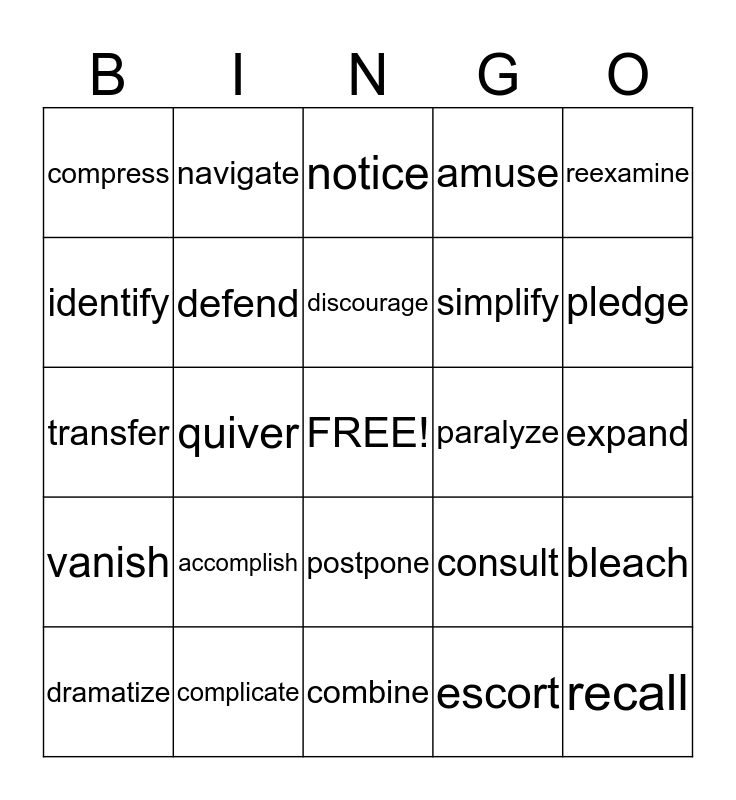 This bingo card has a free space and 24 words: accomplish, complicate, discourage, dramatize, reexamine, compress, identify, navigate, paralyze, postpone, simplify, transfer, consult, bleach, defend, escort, expand, notice, pledge, quiver, recall, vanish, amuse and combine.