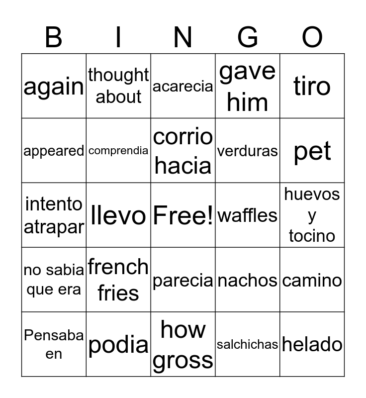 This bingo card has a free space and 29 words: Pensaba en, liked, llevo, le dio, again, acarecia, comprendia, french fries, waffles, podia, huevos y tocino, helado, how gross, salchichas, pet, ran toward, parecia, no sabia que era, tiro, intento atrapar, nachos, walked, verduras, appeared, gave him, thought about, camino, corrio hacia and understood.
