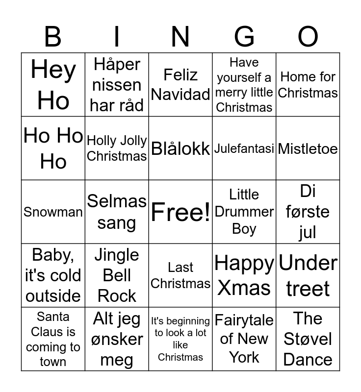 This bingo card has a free space and 33 words: Hei hå nå er det jul igjen, All I want for Christmas is you, Last Christmas, Himmel på jord, Mistletoe, Hey Ho, Selmas sang, Juletragedien, Have yourself a merry little Christmas, Brosjan Jesus, Ho Ho Ho, Håper nissen har råd, Driving home for Christmas, Fairytale of New York, Home for Christmas, Snowman, Jingle Bell Rock, It's beginning to look a lot like Christmas, Happy Xmas, Di første jul, Santa Claus is coming to town, Stjernesludd, Feliz Navidad, Little Drummer Boy, The Støvel Dance, Baby, it's cold outside, Holly Jolly Christmas, Blålokk, Julefantasi, Under treet, Engler i sne, Alt jeg ønsker meg and Når julen kommer.