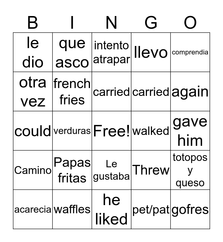 This bingo card has a free space and 29 words: acarecia, veggies, verduras, Corrio Hacia, le dio, intento atrapar, french fries, Papas fritas, walked, waffles, gave him, gofres, he liked, pet/pat, again, understood, Le gustaba, Camino, comprendia, could, Threw, Ran towards, carried, otra vez, llevo, que asco, totopos y queso, carried and how gross.