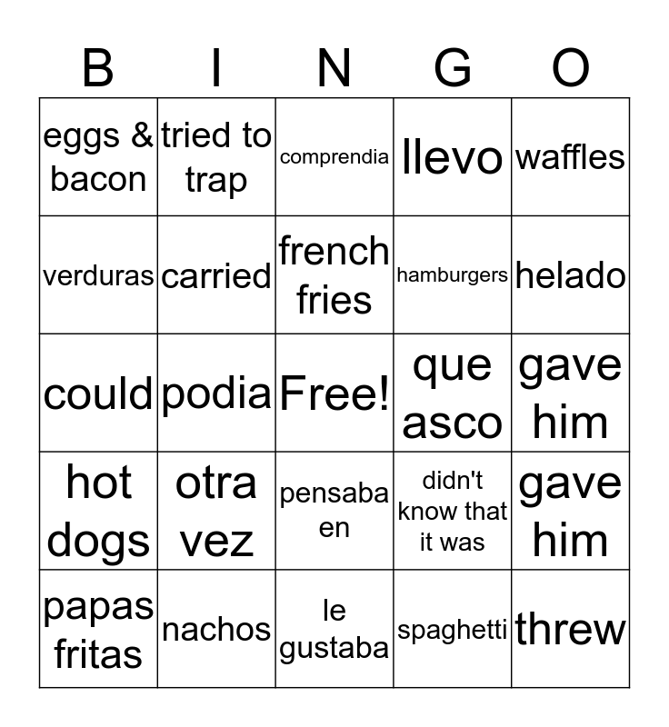 This bingo card has a free space and 29 words: papas fritas, seemed, podia, walked, eggs & bacon, comprendia, carried, otra vez, que asco, nachos, gave him, threw, le gustaba, spaghetti, helado, corrio hacia, pensaba en, hot dogs, waffles, could, didn't know that it was, acarecia, hamburgers, verduras, llevo, tried to trap, gave him, french fries and totopos y queso.
